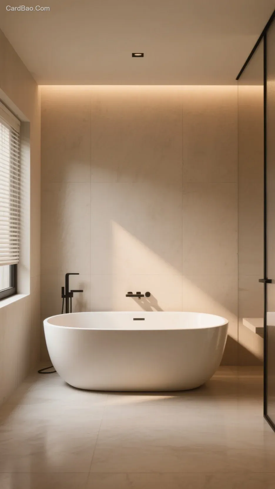 现代极简风浴室 明确空间风格,暖色调柔和光线 定调氛围,浴缸(状态+互动元素)是视觉焦点,生活感+自然延伸感,超写实 光影细腻 材质质感 保障画面真实度,产品级展示 适配商业视觉,提升画面质量,墙体正面
