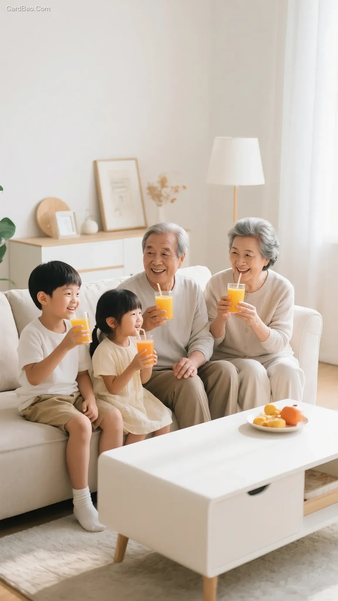 客厅,一家人喝果汁,老人小孩都有,温馨场景,暖白色调