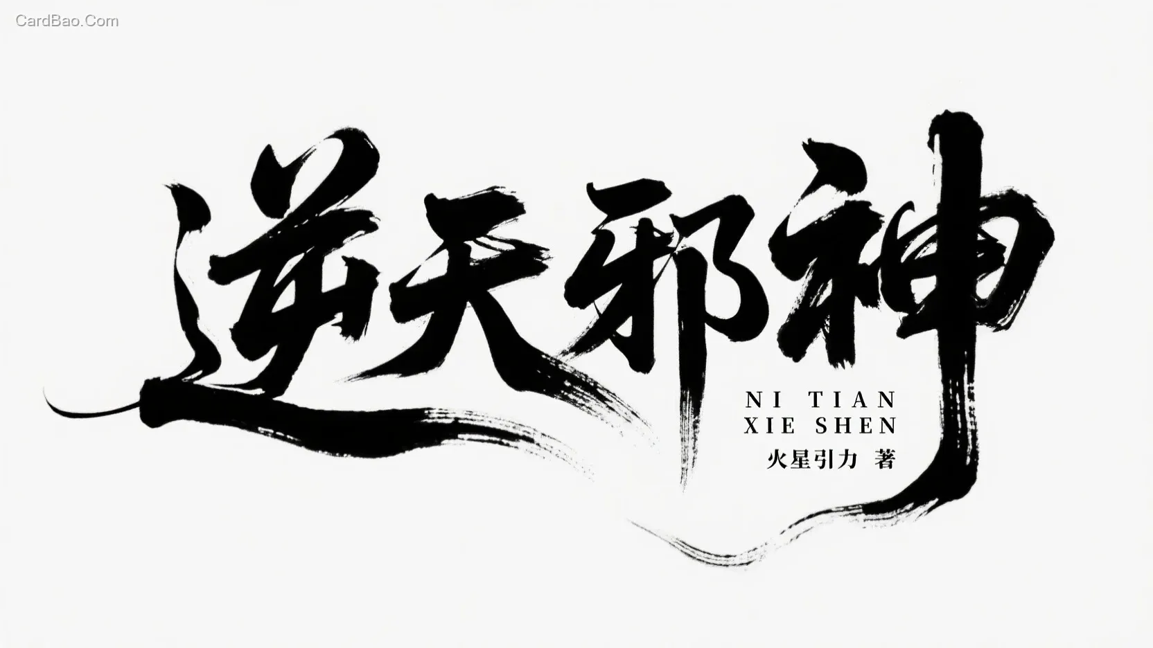 书法字体海报“逆天邪神”,草书字体狂野奔放,视觉张力富有动感,超粗笔画流畅飘逸,笔画巧妙延长变形,飞白效果,笔画流畅潇洒,干净背景,大师海报作品,电影海报,英文“ NI TIAN XIE SHEN ”和小字“火星引力 著”作为点缀