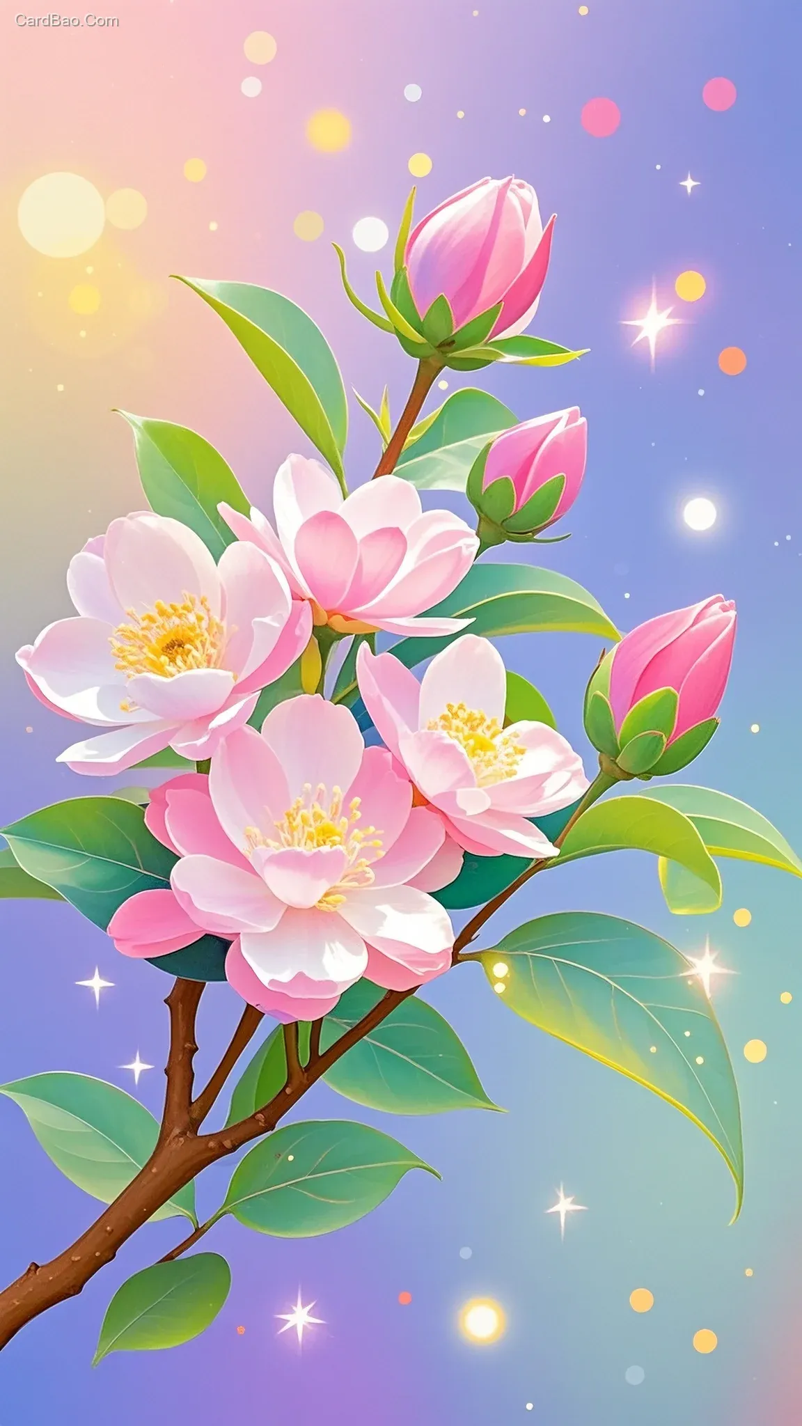 The main subject of the image is a floral branch, with blooming pink petals transitioning from light pink to white, featuring distinct yellow stamens. It is accompanied by clusters of tender pink buds and vibrant green leaves, with a brown stem extending naturally. The background adopts a gradient of blue-purple tones, scattered with soft pink, yellow, and green light spots, accented by delicate white elements, creating a dreamy and elegant ambiance. The overall composition presents a fresh and refined illustration style, with smooth color transitions and rich, vivid details.