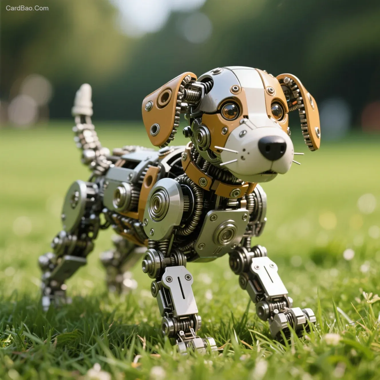 A small dog assembled from mechanical parts, with intricate details, playing on a lush green lawn.