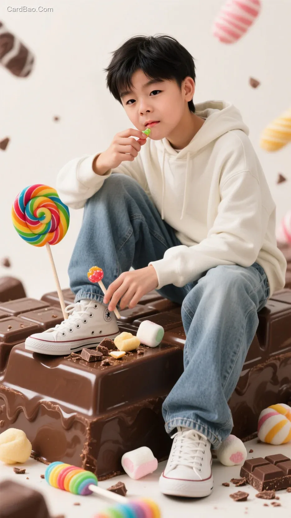 ##浓郁的巧克力和糖果甜香弥漫在空气中。13岁的黑发少年惬意地坐在一块巨大、光滑的牛奶巧克力块上,如同他的王座。他身着舒适的卫衣和宽松牛仔裤,裤腿松垮地堆叠在脚踝,盖住了部分干净的白色帆布鞋。少年大眼睛明亮有神,英俊的脸庞带着一丝专注的调皮。他微微倾身,伸出修长的手指,灵巧地从身旁散落的一大堆色彩斑斓的糖果(棒棒糖、彩虹糖、棉花糖)和砖块大小的巧克力碎块中,沾起一小撮浓稠的巧克力酱。指尖送到唇边,他轻轻吮吸品尝,眼睛满足地眯了起来,舌尖尽情享受着那丝滑浓郁的甜蜜。真实风格
