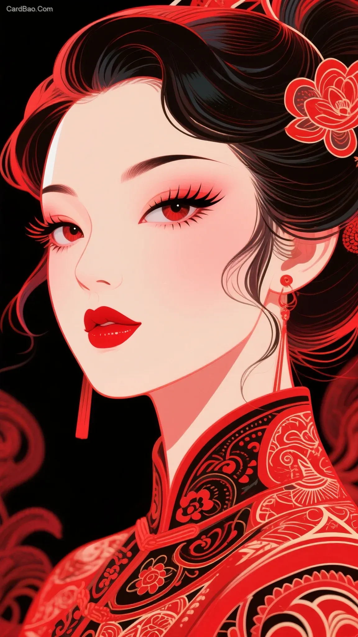 Stunning beauty, thick eyebrows and big eyes, long eyelashes, red lips, various hairstyles, fashionable and modern, traditional batik, Chinese trendy illustration, fluorescent texture, red color scheme, ultra-detailed, traditional patterns, highest quality, illustration style.
