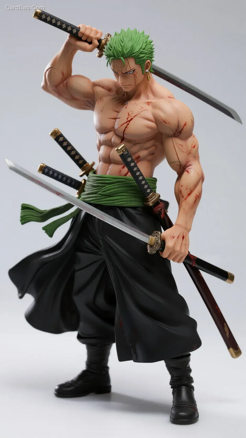 One Piece Zoro Realistic Style Action Figure Model: Ultra-detailed facial sculpting showcases scars and determined gaze. The green haramaki's texture is replicated from real linen scans with visible weave details. Three sword sheaths feature intense metallic finishes, while black trousers exhibit natural and realistic wrinkles. Eight-pack abs utilize nano-level UV printing to depict sweat droplet trails. Full-body muscles boast extreme detailing with smooth, powerful lines. Earrings feature weathered treatment. 16K-resolution 3D modeling reveals individual hair strands, with ZBrush-carved sword marks precise to 0.1mm depth. Industrial-grade printing accuracy reproduces fabric fiber details, while subsurface scattering technology creates skin translucency. Dynamic sword-drawing pose freezes explosive motion. Battle-damaged version includes gradient rust treatment on blades, with fingerprint-level artisan details preserved in shadow areas. Wounds incorporate fiber-optic lighting to simulate bleeding effects. Clothing folds are solidified using fluid simulation data. Finger joints employ medical-grade silicone over alloy skeletons. Boot soles perfectly replicate manga's anti-slip tread patterns. Shot with ultra-wide-angle lens, delivering 32K ultra-HD cinematic quality.