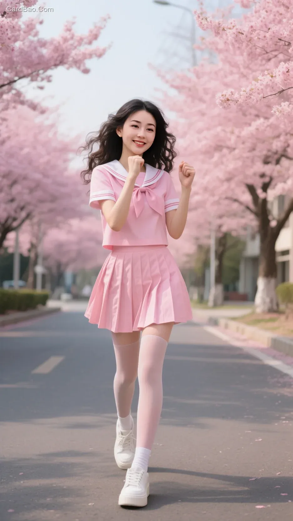 ## Youthful Academy Style: A young woman with wavy, dynamic black hair, wearing a pink short-sleeved sailor top paired with a pleated skirt, iridescent flesh-toned tights, and white chunky sneakers with clear material details. She stands on a campus pathway lined with century-old pink cherry blossom trees and floral accents, exuding a sweet smile with innocent eyes, her hands clenched into fists and placed beside her cheeks. The overall color palette is bright and lively, with rich detailing.