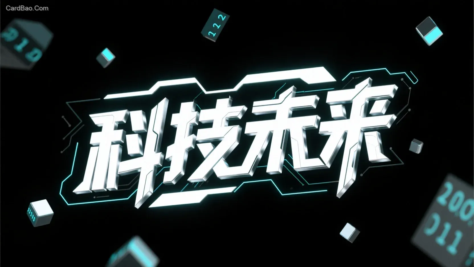 黑色干净背景,白色宇体"科技未来”以极具科技感的风格呈现,宇体边缘闪烁着金属光泽,笔画带有机械棱角与流线设计,融入霓虹光效的电路纹理,周围环绕着漂浮的二进制代码和不规则几何光块,营造出充满未来感与科幻氛围的视觉效果