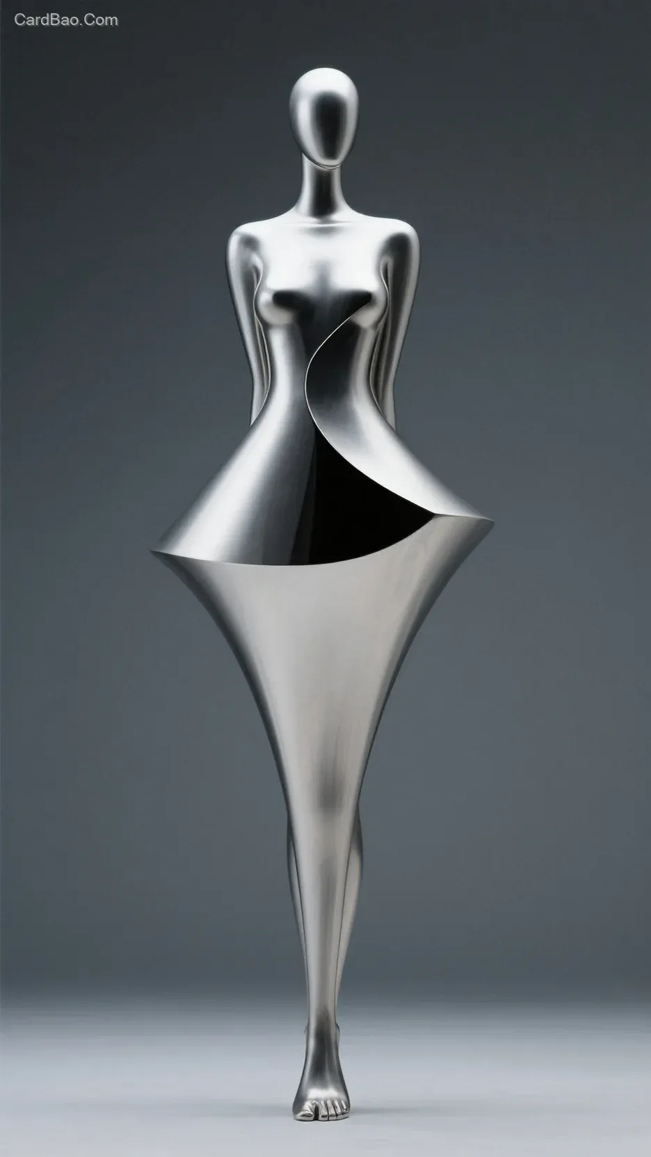 Modern art, minimalist style sculpture, with a fantastical feel, humanoid silhouette, abstract yet refined style, exaggerated body proportions, dynamic, elegant, slender and smooth curves, a proud and flawless form, funnel-shaped artistic posture, a slender waist, cold metallic facets concealing a rounded pear-shaped figure, abstract feet, abstract and exaggerated, silky smooth, dynamically graceful form, creating a minimalist and mysterious modern aesthetic, 16K ultra-high definition.