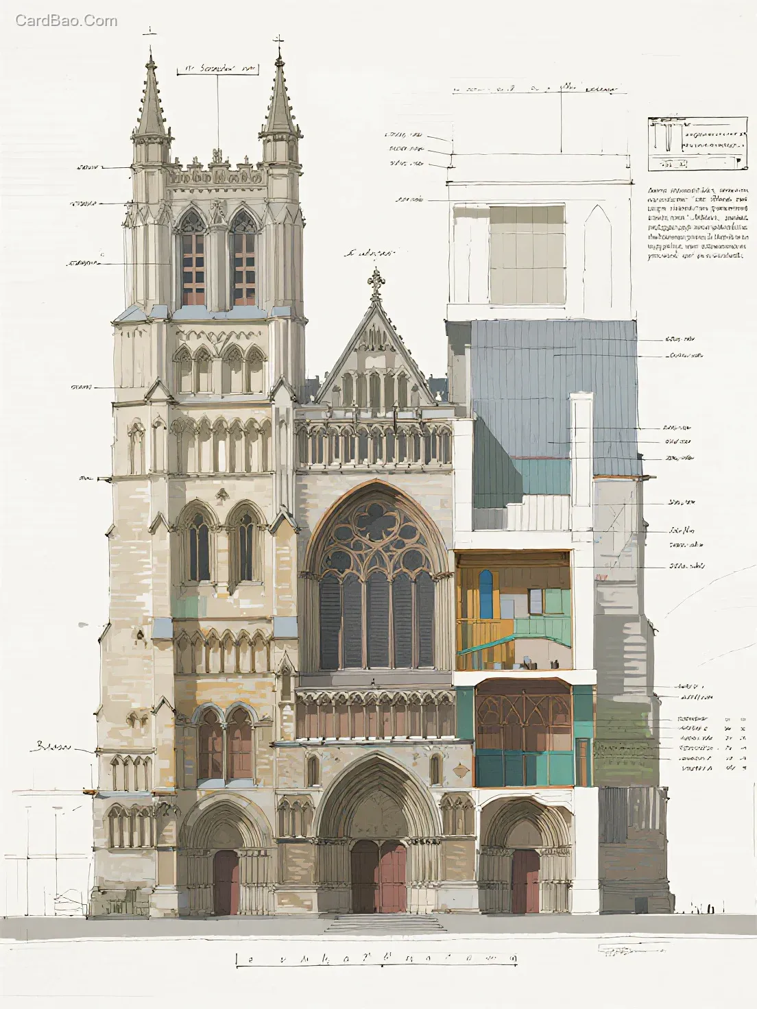 白色背景,大量留白,扁平风,建筑设计,建筑立面透明剖面图,索尔兹伯里大教堂,建筑内部结构使用不同颜色描绘,极繁主义,钢笔线稿,细腻的线条,清晰明了。左右标注详细参数,细腻光影,深度与层次,丰富细节。