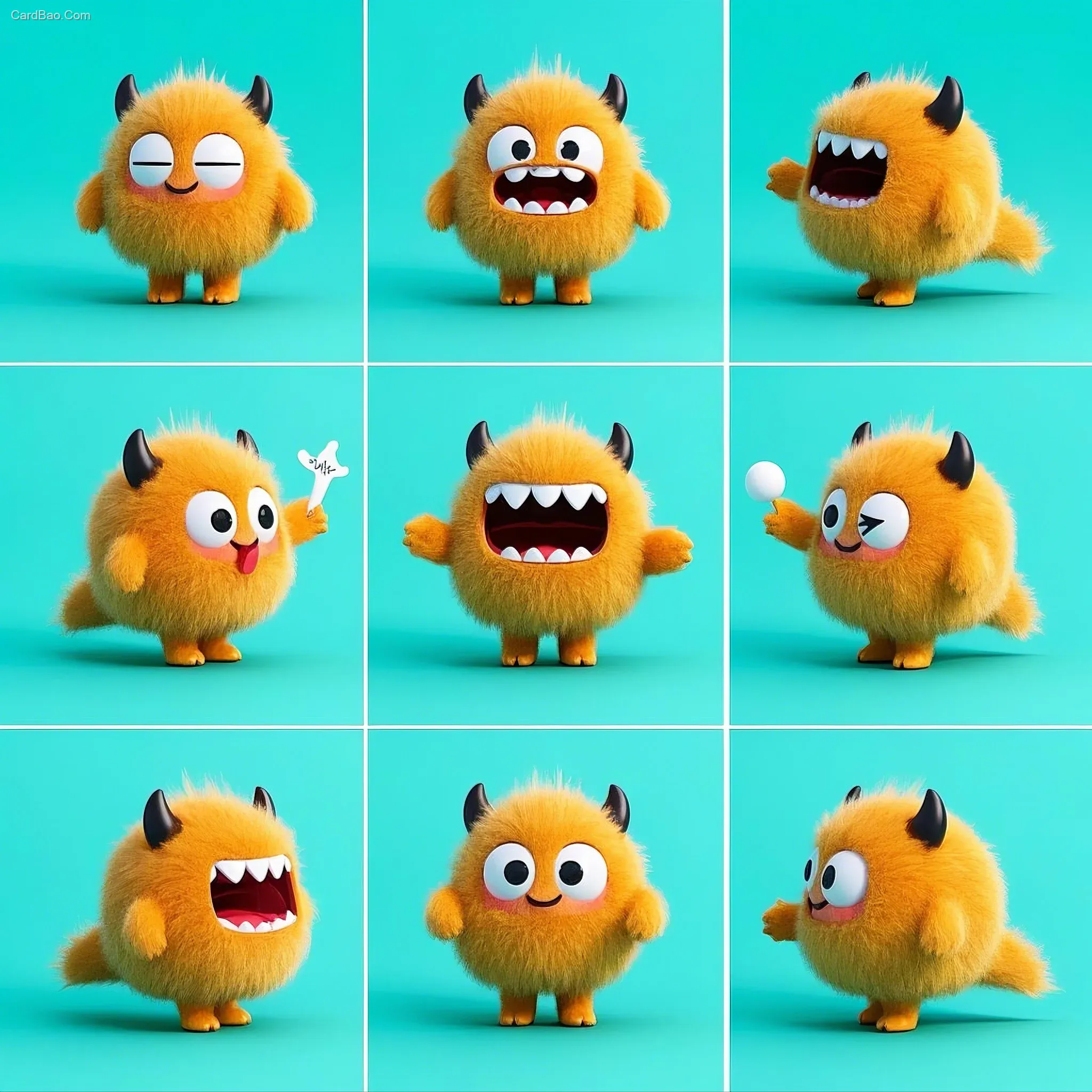 Main subject of the picture: A cute and mischievous anime - style [little monster], with facial features, upper body or whole body. Emotion: All kinds of expressions and movements, with exaggerated movements, exaggerated expressions and infectious. Style: Q - style cute, furry. Picture quality: Exquisite details, Ultra - HD, 8K, C4D. Picture layout: Nine - grid, one avatar in one grid, without showing grid lines, fresh background.