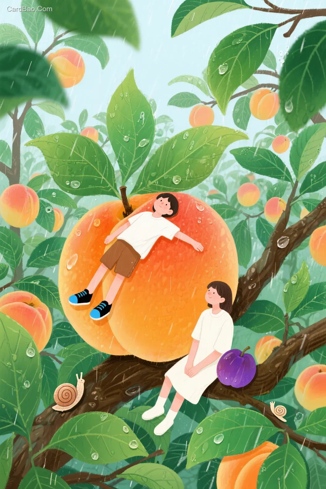 Illustration, from a bird's - eye view. Among the lush branches and leaves of the apricot tree, there is a huge orange apricot. On it lies a person wearing a white top and brown shorts and blue - and - black - colored shoes. Beside it, there is also a person in white sitting, and a purple fruit is placed beside them. There are a great number of apricots and green leaves around. There are water droplets on the leaves and several snails as well. It is raining in the sky, creating a fresh and natural atmosphere.