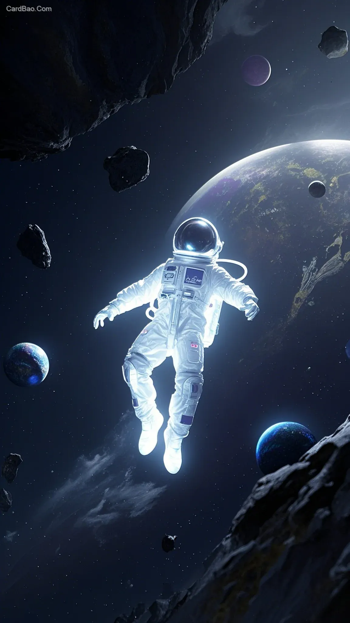 Cosmic photography, a silent atmosphere. The astronaut is the only bright spot in the pitch - black space, falling downward, with a sense of weightlessness and a feeling of falling. A full - body portrait with a CG - like texture. Wide - angle shot. The astronaut is wearing a transparent, luminous fluorescent spacesuit, with a faint colored - light - emitting clothing, a white - light - emitting keynote, a dazzling laser - fluorescent garment, a pearlescent feel in the gloom, the art of light. A picture with a textured craftsmanship, a dynamic perspective.