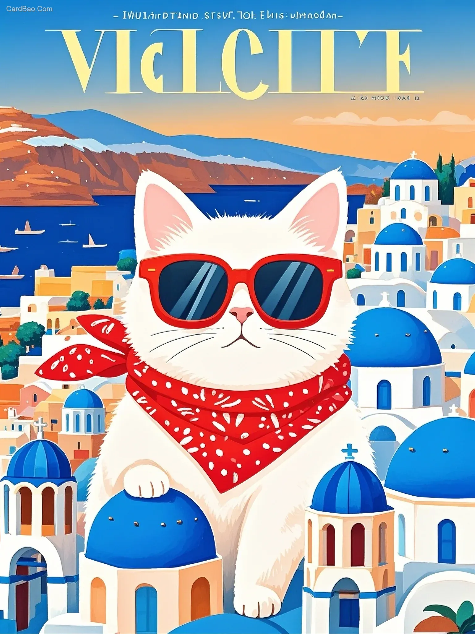 Picture - book illustrations, animated graphics, vector illustrations, art magazine covers. A white cat wearing sunglasses and a red scarf, in Santorini style, with high saturation and high definition.