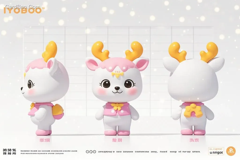 吉祥物设计,盲盒风格, 全身, 可爱的白色色小鹿,, 干净的背景, 三视图,即正面图、侧面图和背面图, 插画,扁平