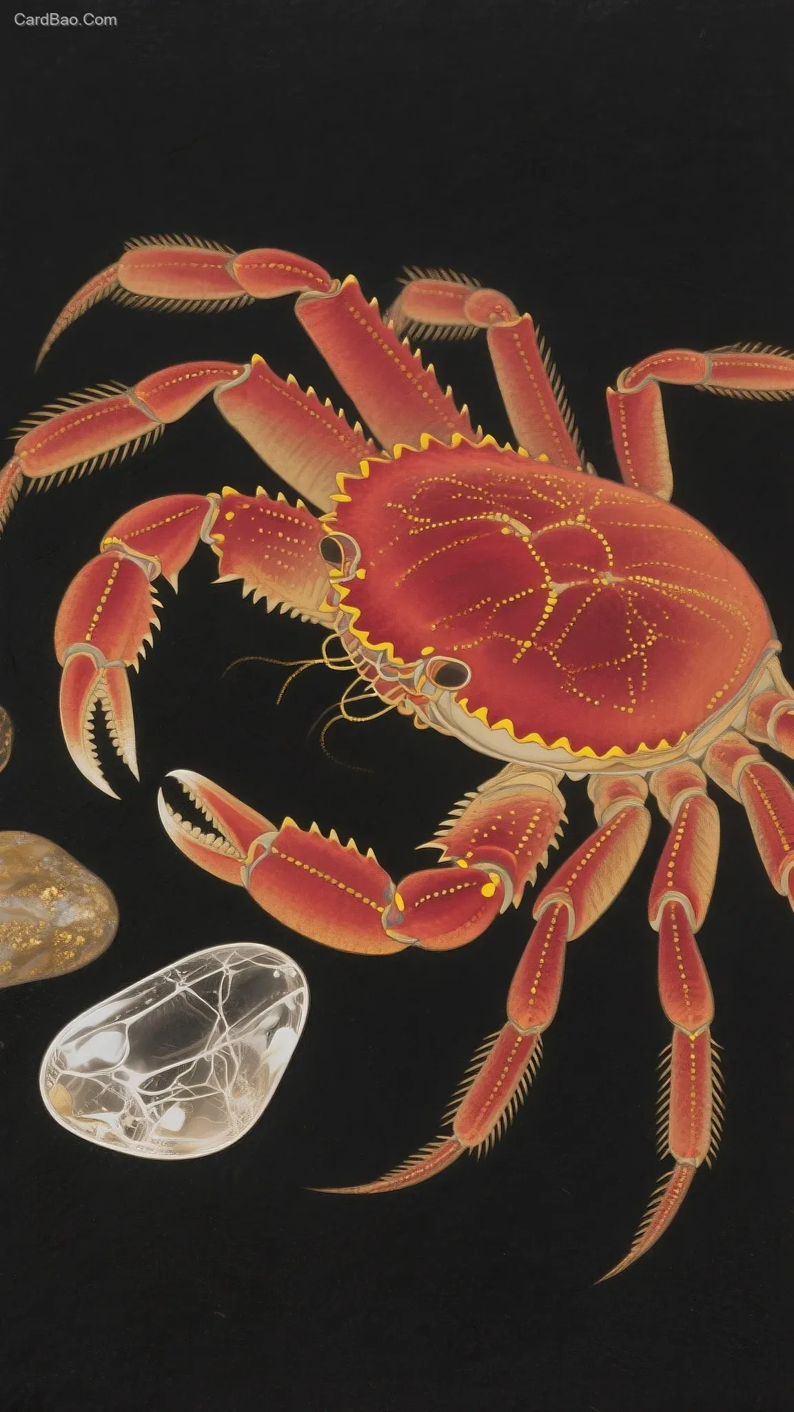 穆卡,威廉·莫里斯,尼克·维西,宏观摄影,螃蟹和透明卵石,纹理清晰,半透明风格,工笔技法,X射线,暗红色黄色金色,点和线,黑暗背景,新工笔,纹理哑光,漫反射渐变,极简风格。