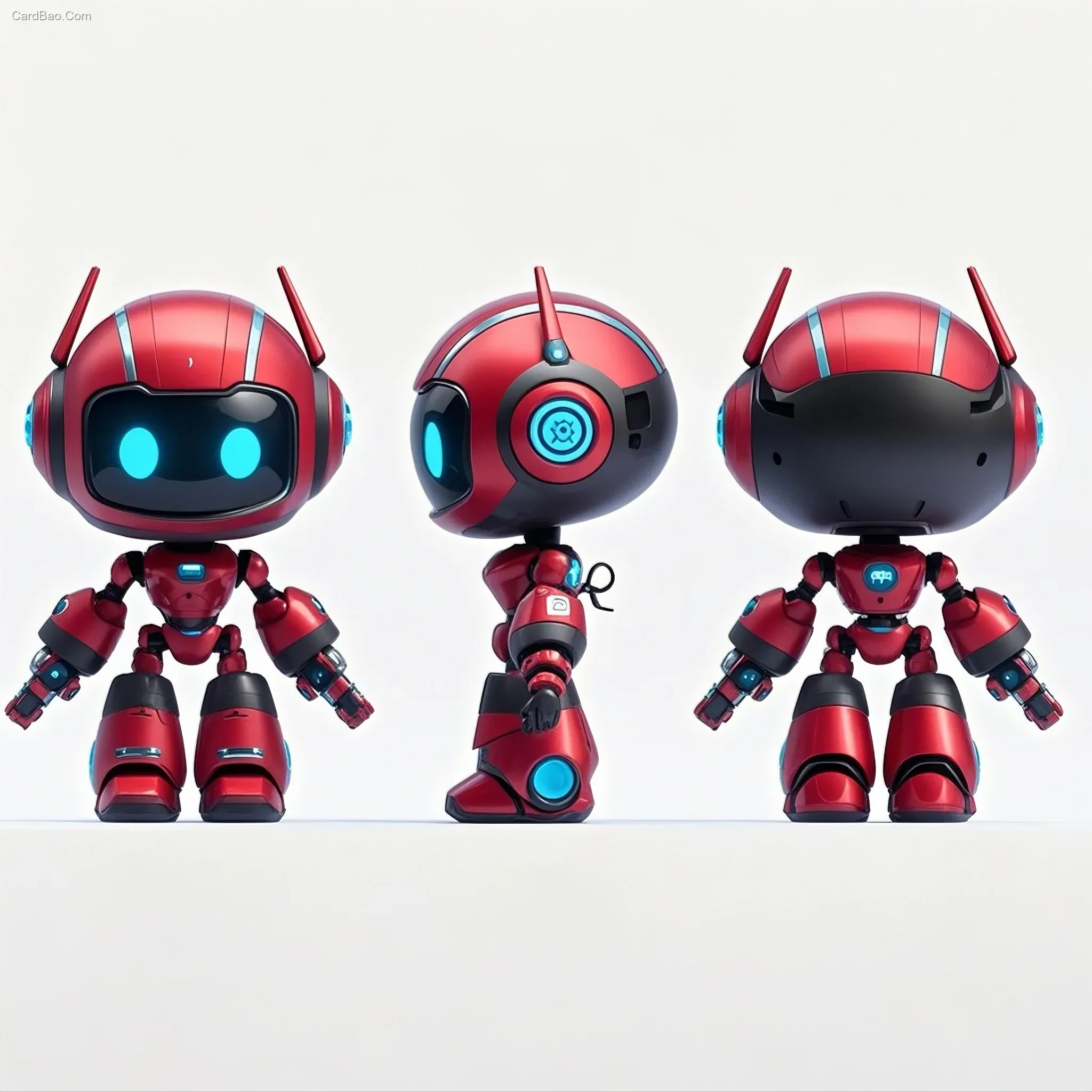 Character IP design, three - view drawings: front, side, and back pictures. A chibi - style intelligent robot, with blue light, a red robot, technology, artificial intelligence, high - definition details, standing, front view, full - length portrait, white background, solid - color background.