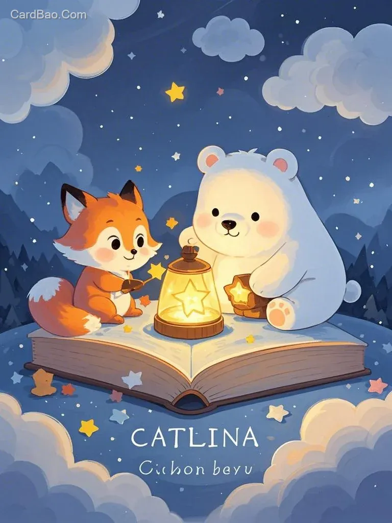 A picture - book - style cartoon painting with a dark blue background. It is a story - book - style picture with a cute little fox and a chubby little white bear, featuring a pure - color background in a chibi - style. It can be used as wallpaper, with blank space left by the engine, and has an aesthetically pleasing visual effect.