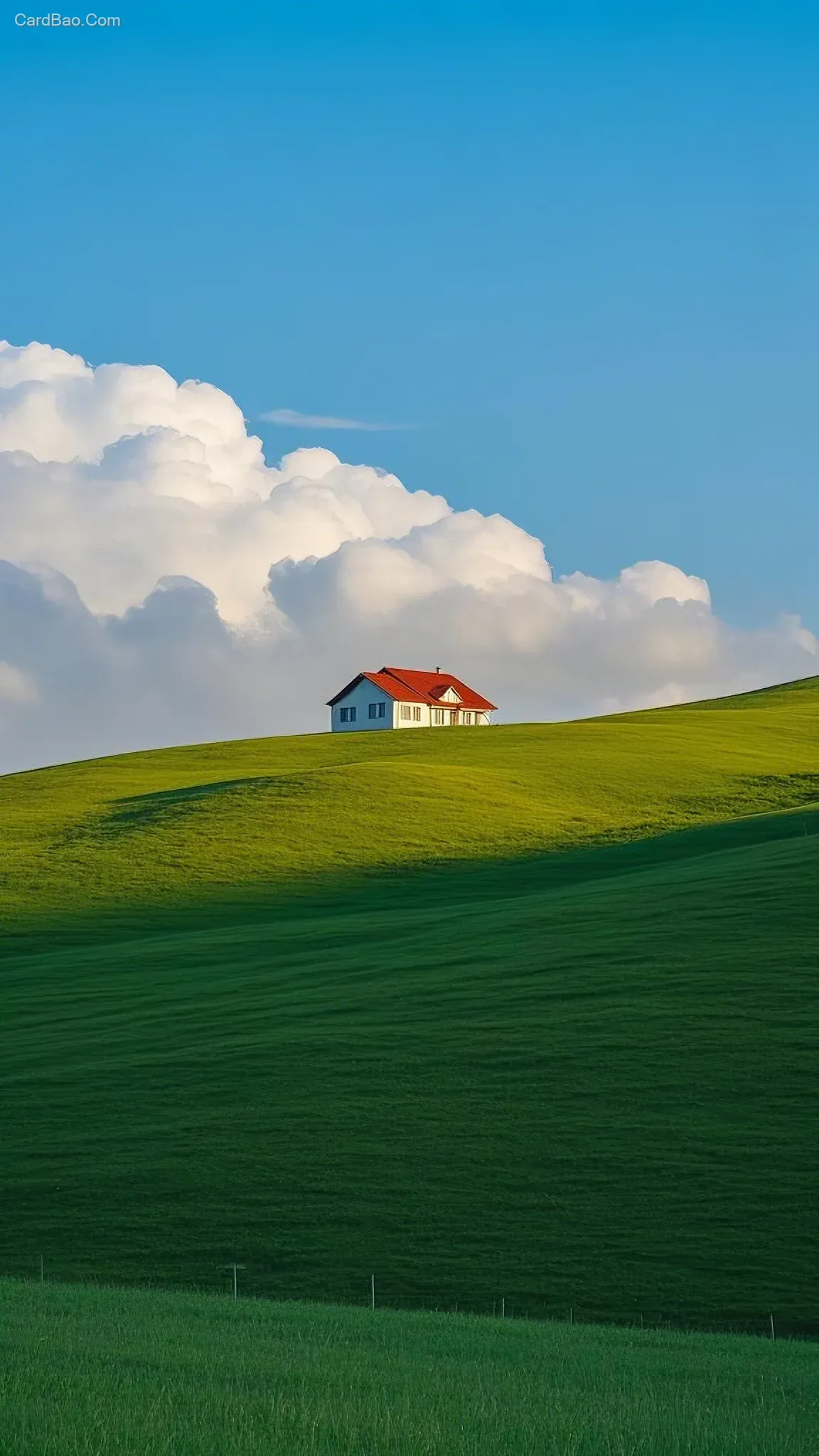 摄影风格,高清画质,一片开阔的绿草山坡在阳光的轻抚下,宛如一块柔软的绒毯向远方铺展。山坡之上,一座精致的红瓦房小屋静静伫立,白色的墙壁在蓝天的映衬下愈发显得干净纯粹。远处,湛蓝的天空中,洁白的云朵如棉花糖般随意飘浮,时而聚集成群,时而又缓缓散开,仿佛在悠然诉说着生活的惬意。微风轻拂,带来青草的芬芳。
