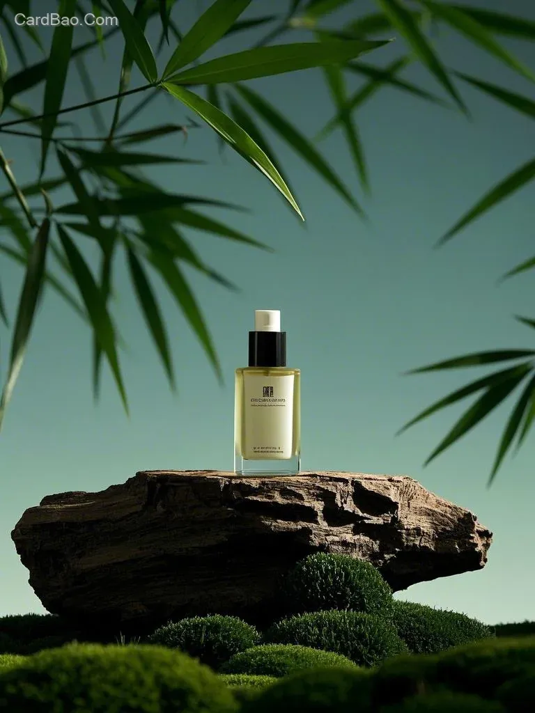 Creative composition, commercial shooting in a cosmetics scene, new Chinese - style, one bottle of cosmetics with retro packaging, ultra - wide - angle lens, bamboo leaves.
