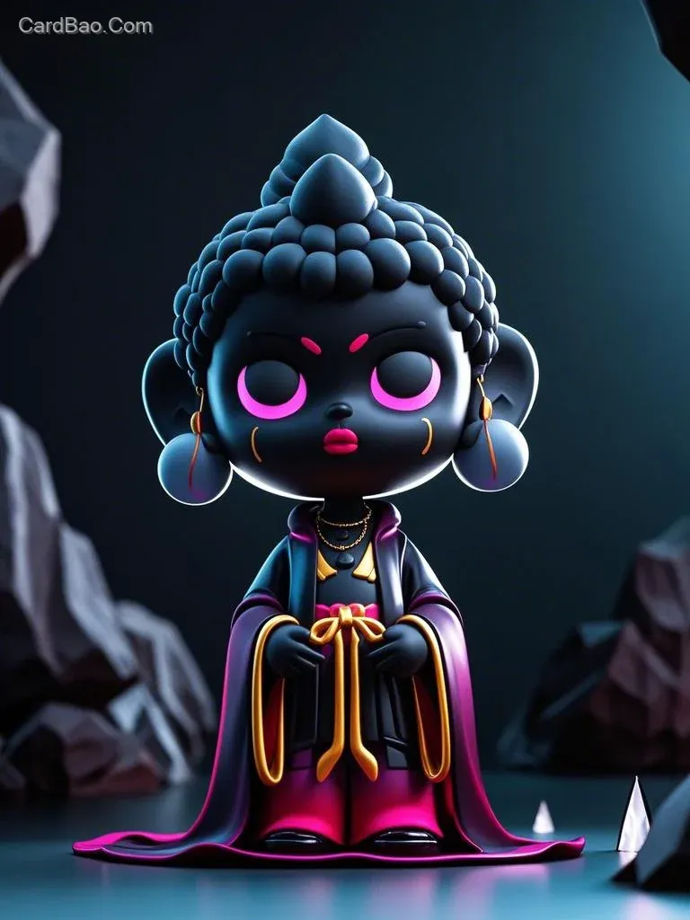 c4d,超现实,特写,可爱前卫的打扮和风格,韩系插画,极简主义,撞色,颜色暗黑,黑化的Q版如来佛祖