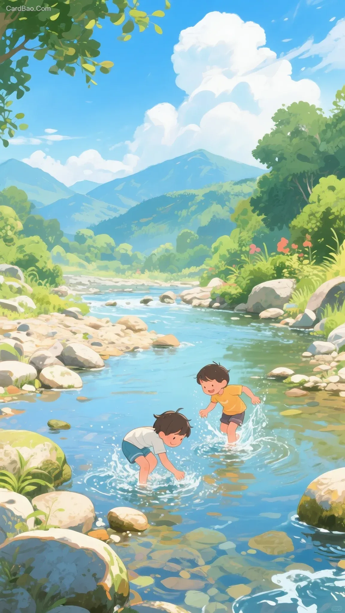 环境质感:清澈溪水、错落石滩、朦胧山景 ,插画风格,颜色丰富多彩明亮,画质清晰 8k