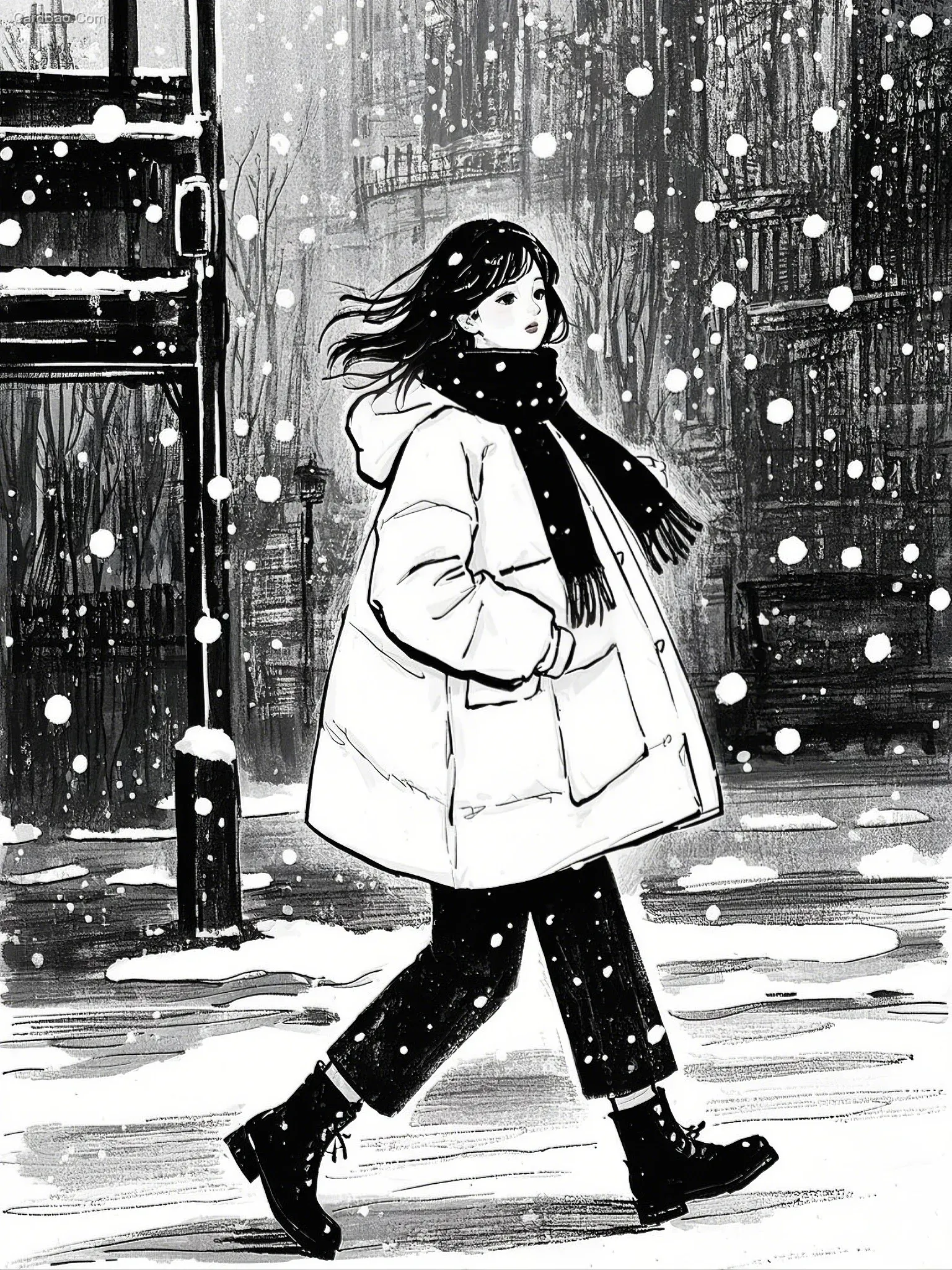 白描风格,一位妙龄少女,穿着白色羽绒服黑色围巾,黑白的线条具有白色背景图案,矢量手绘插画,艺术插画,复杂的细节,城市冬天背景,高清