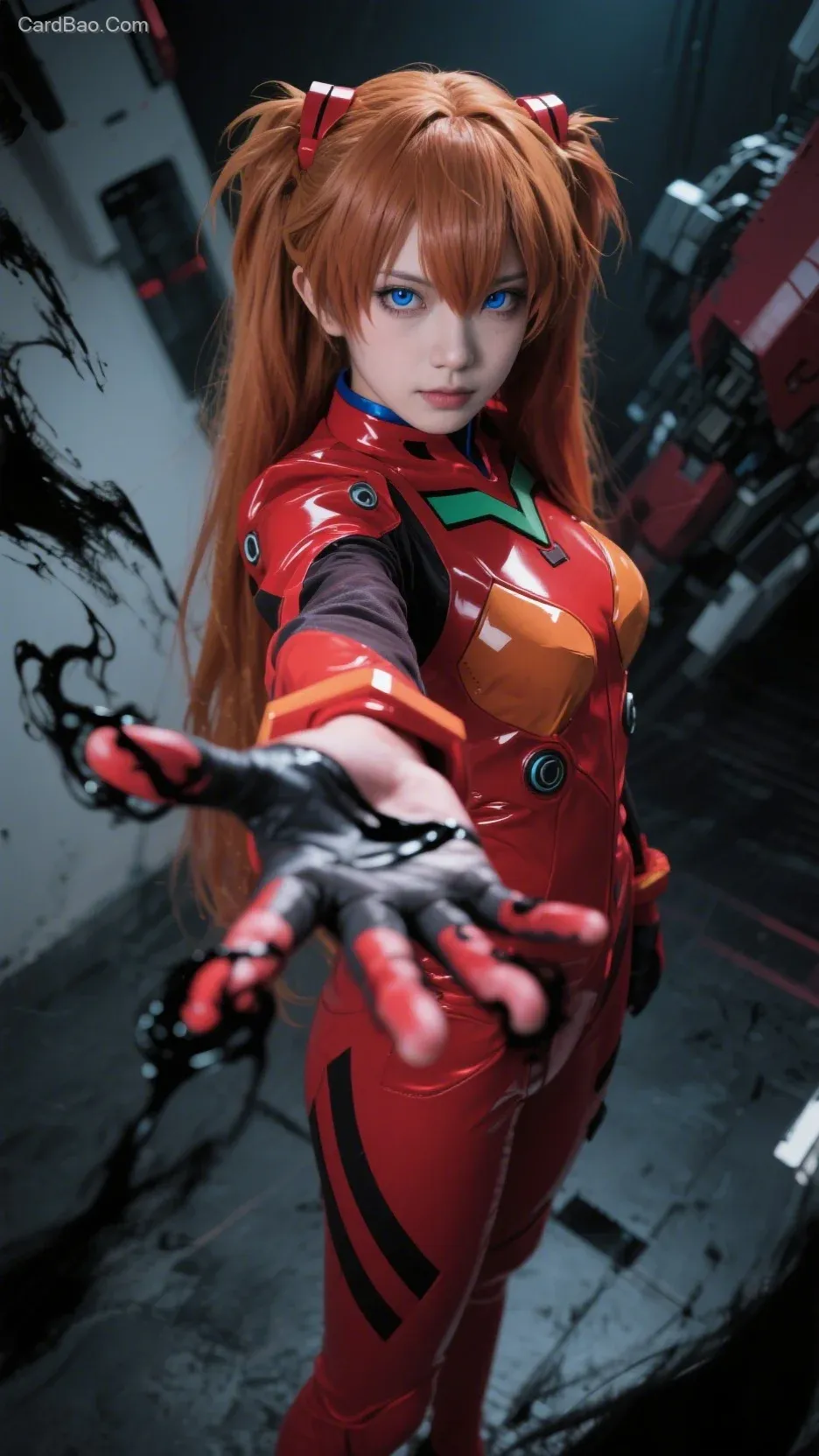 A close - up of a real - person cosplay of Asuka in a red combat suit from a top - down view. In the ink - wash - smeared mecha background, the right hand stretches towards the camera, with ink - colored special effects flowing from the fingertips. The close - up of the eyes shows cold blue pupils. The real skin texture is intertwined with the reflection of silk. 9:16 aspect ratio with a low - key diagonal composition.