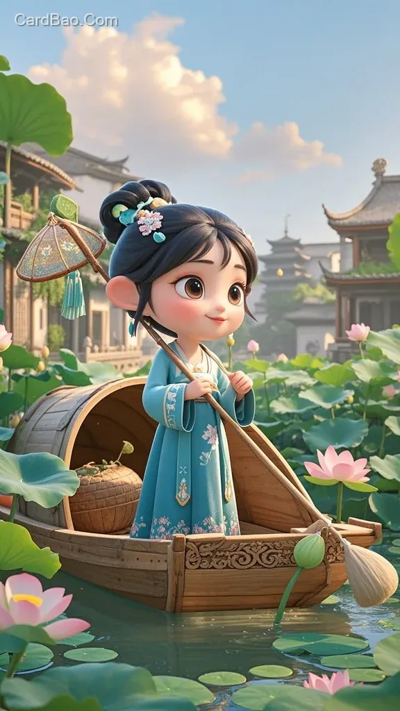 A chibi - style girl dressed in a light - blue Han - dynasty - style ancient costume embroidered with cloud patterns is standing on a decorated small boat, holding lotus - picking tools. The environment is the Jiangnan water town, surrounded by large areas of lotus leaves and lotuses. It is a delicate ancient Chinese - style cartoon with bright and soft colors and in 3D Pixar style.