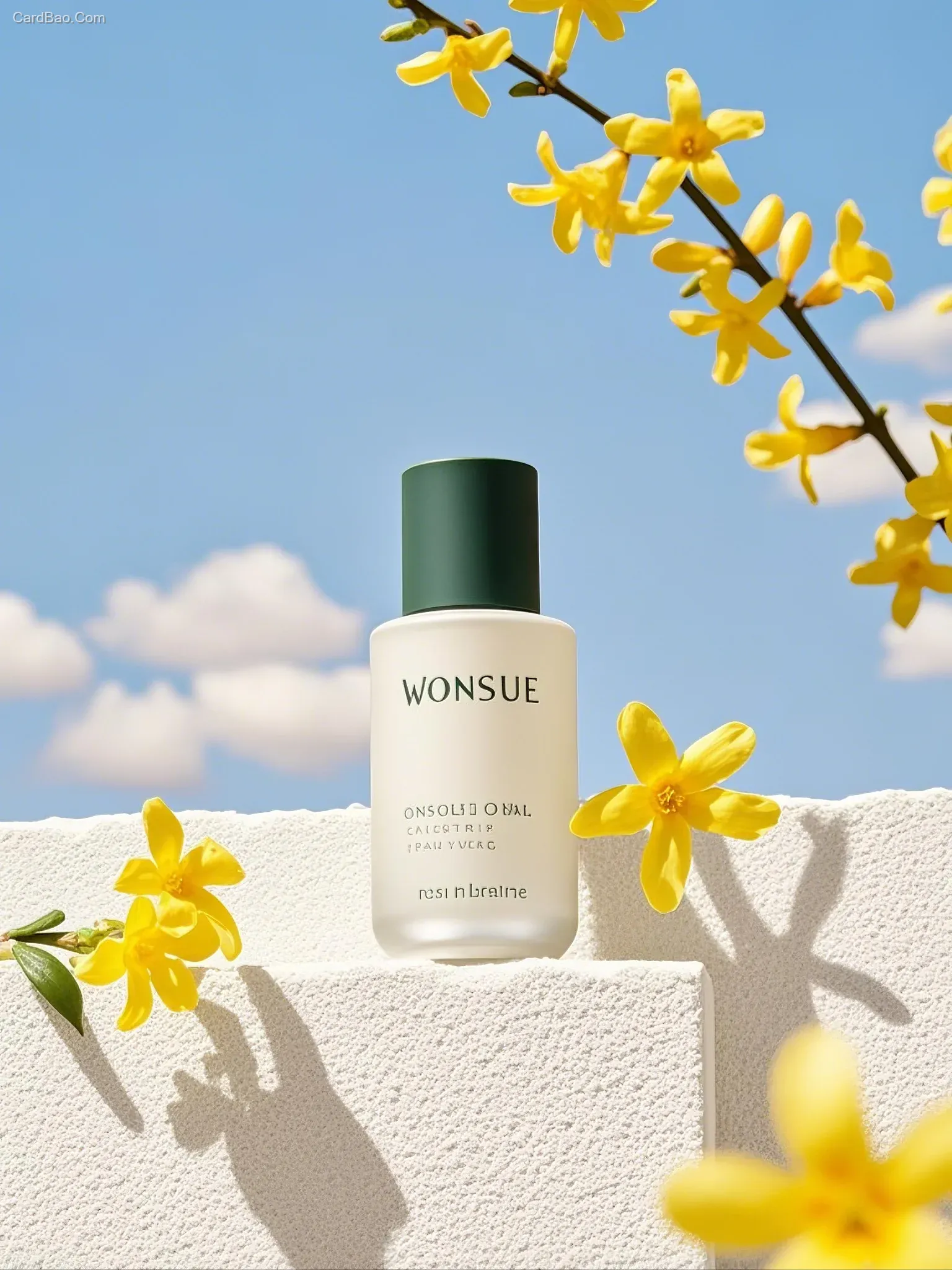 一款精华液产品图,显示品牌为“WONSUE”,白色的圆柱形护肤品瓶,绿色瓶盖,放在简洁的白色石膏体上,前景是几朵点缀的黄色迎春花,中景是产品,背景是明亮的蓝天和蓬松的白云。明亮通风,自然光,清新干净自然。超细节,4K 分辨率