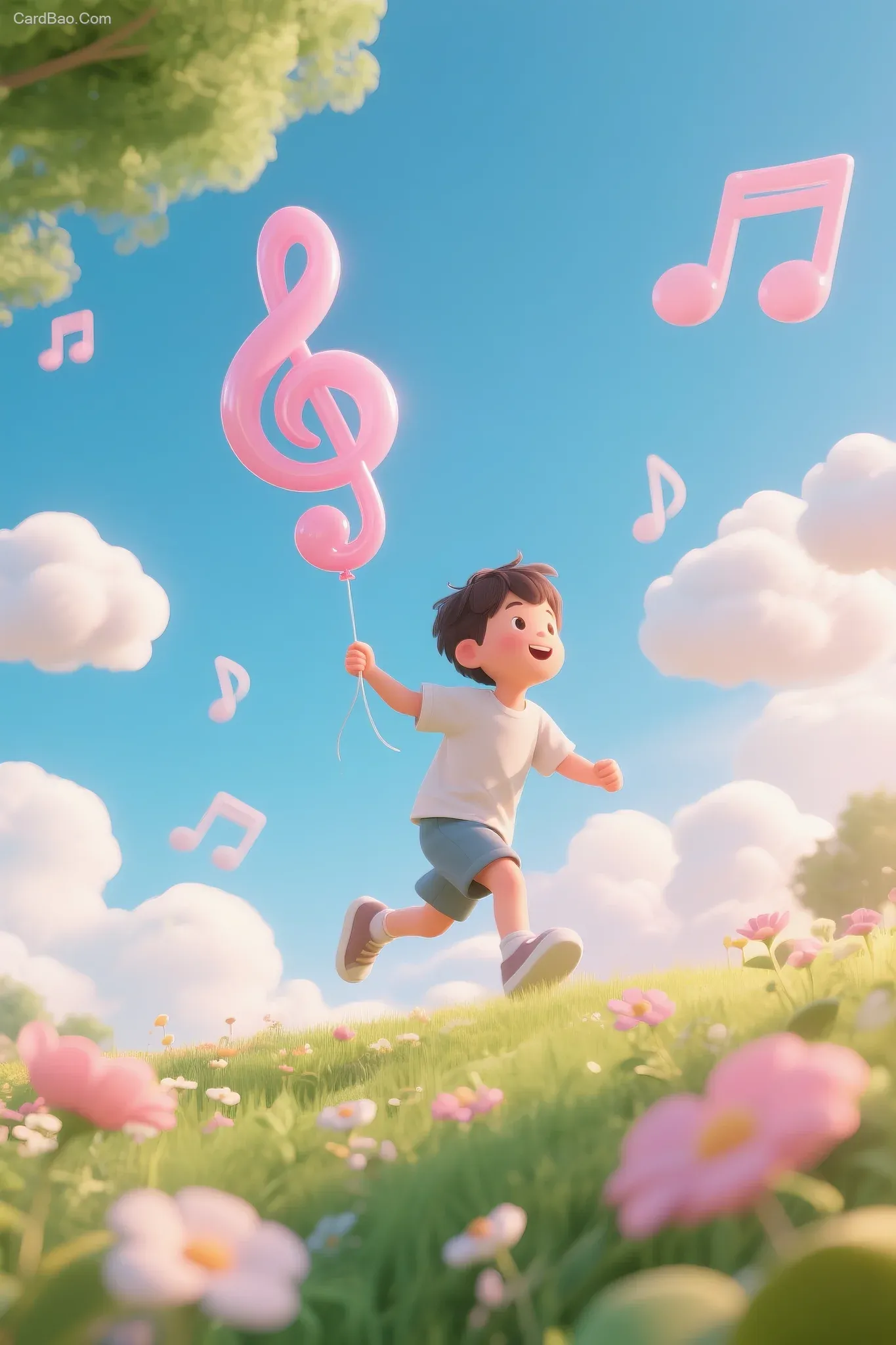 在前方的是一个奔跑着拿着音符形状气球的小朋友男孩穿着舒适的t恤和短裤,天空中飘满了蓬松的白云,有些云朵形状像音符,这一幕沐浴在温暖的阳光下,下面的花草营造出一种柔和梦幻的氛围。以柔和光滑的C4D风格渲染,带有柔和的绿色、蓝色和柔和的粉红色,这一场景唤起了一种平静、胜利和童年怀旧的感觉。
