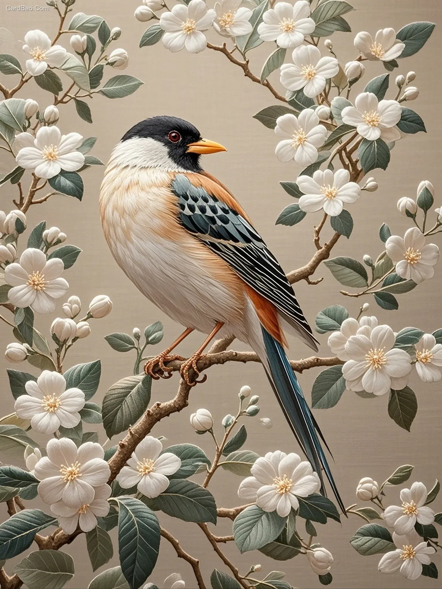 一只鸟栖息在树枝上,周围是精致的白色花朵和叶子,以中国传统艺术的风格刺绣作品,线条和纹理清晰。整体配色方案柔和而温暖,突出了羽毛、喙和爪子等细节,增添了它的美感。这是一个超现实的数字渲染,捕捉到了复杂的刺绣风格