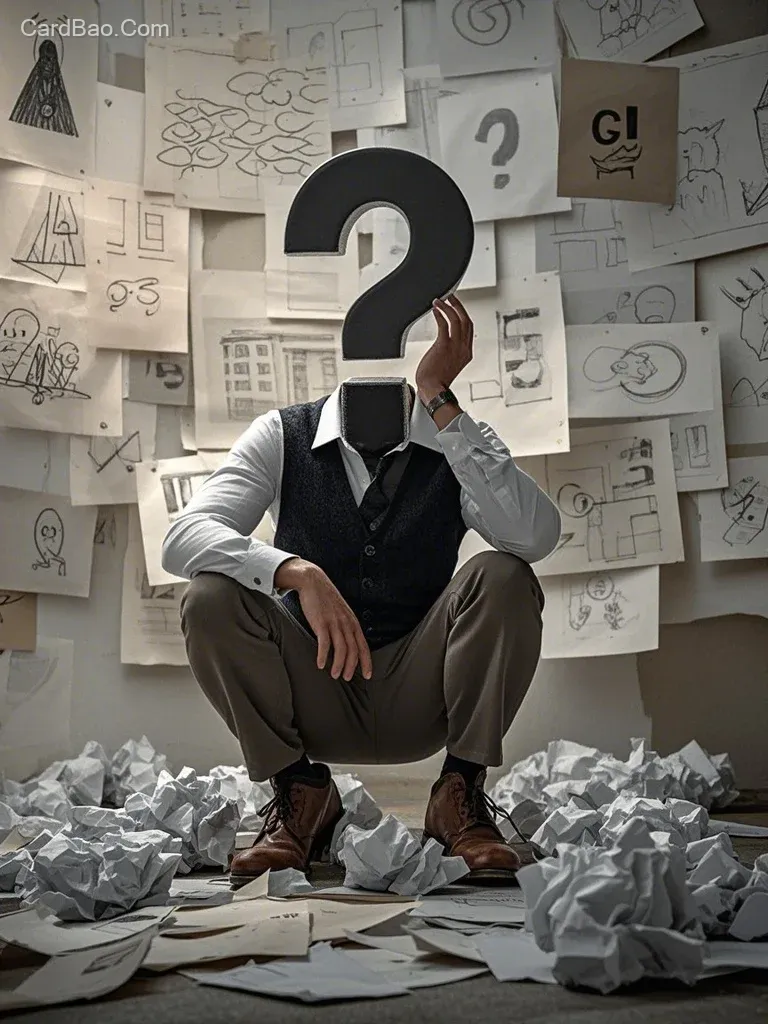 A person with a head in the shape of a question mark is squatting on the ground, scratching his head. There are piles of waste paper on the ground, and many first - draft hand - drawn design drawings are scattered around. Texture GC, skin texture GC, exquisite painting skills, master - level works, digital rendering, GC rendering, HD, HDR.