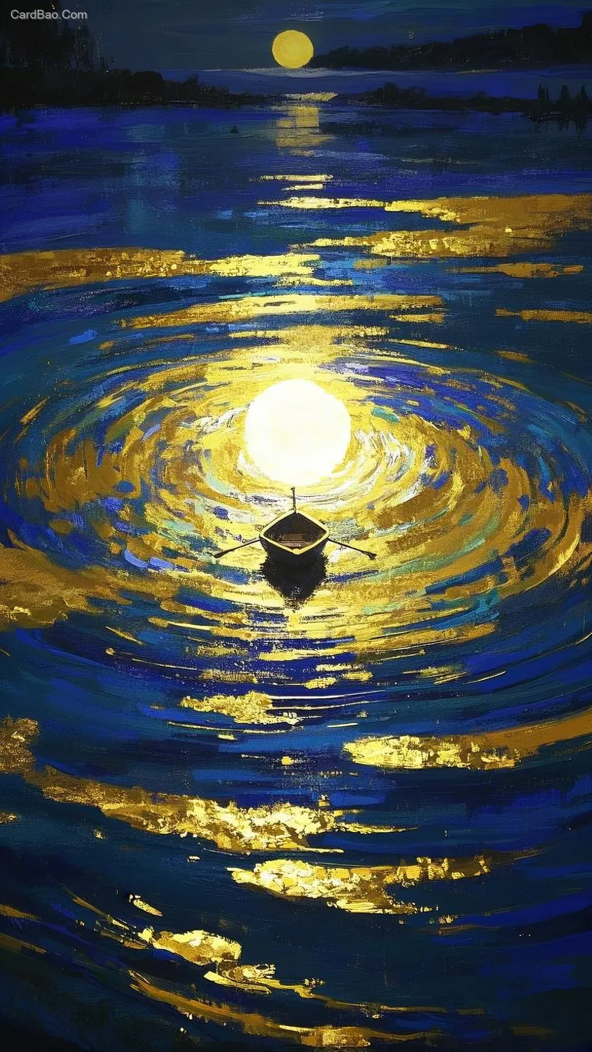 国风之美,在岩彩绘画里尽显,金箔岩彩加持的岩彩画,宛如艺术美学的璀璨明珠,金边边缘色,夜晚的池塘上有一个小船,月光折射,夜晚中的亮光,月光折射那震撼大气的笔触与色彩,似电影画面般动人心弦,每一幅都是令人叹服的艺术佳作,尽显独特韵味,创意艺术作品,专业绘画,高级感