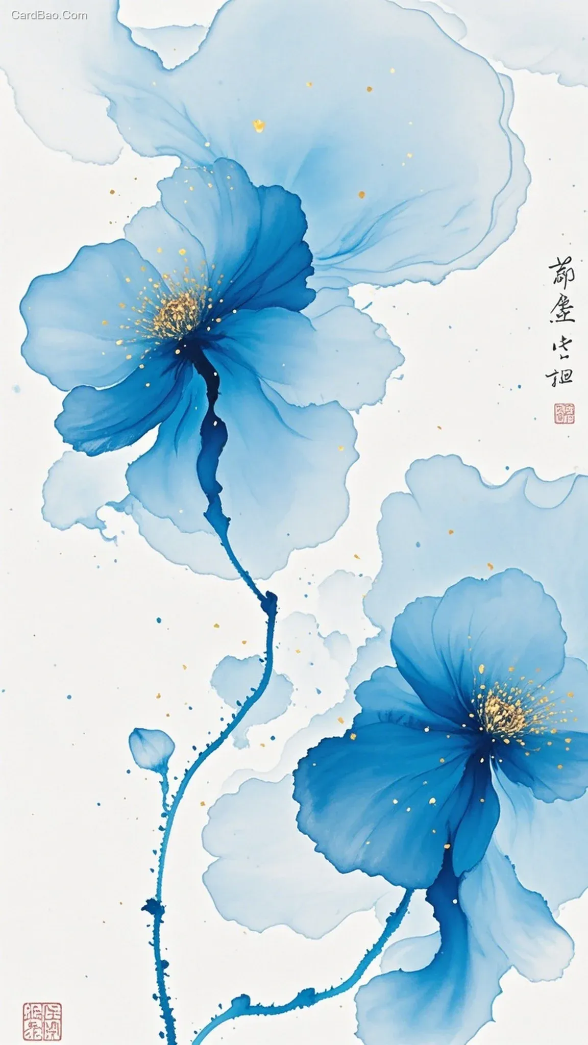 淡蓝色留白,极简风格,泼墨画,手机壁纸,淡蓝色和金箔做出轻盈的艺术感,水墨渲染效果明显与水墨花朵高度融合,意识流,飞溅流动,传统与现代结合,国风意境,极具视觉美感。画面无文字印章