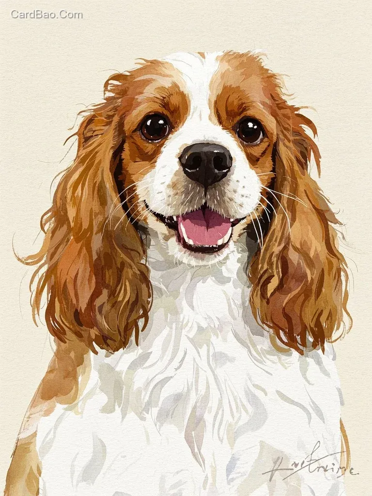 Picture - book illustration. The lines are simple. The background is an advanced single - colored beige with large areas of blank space. There is a Cavalier King Charles Spaniel with a delightful and lovely expression. The background is a watercolor painting background and it is a close - up of the dog.