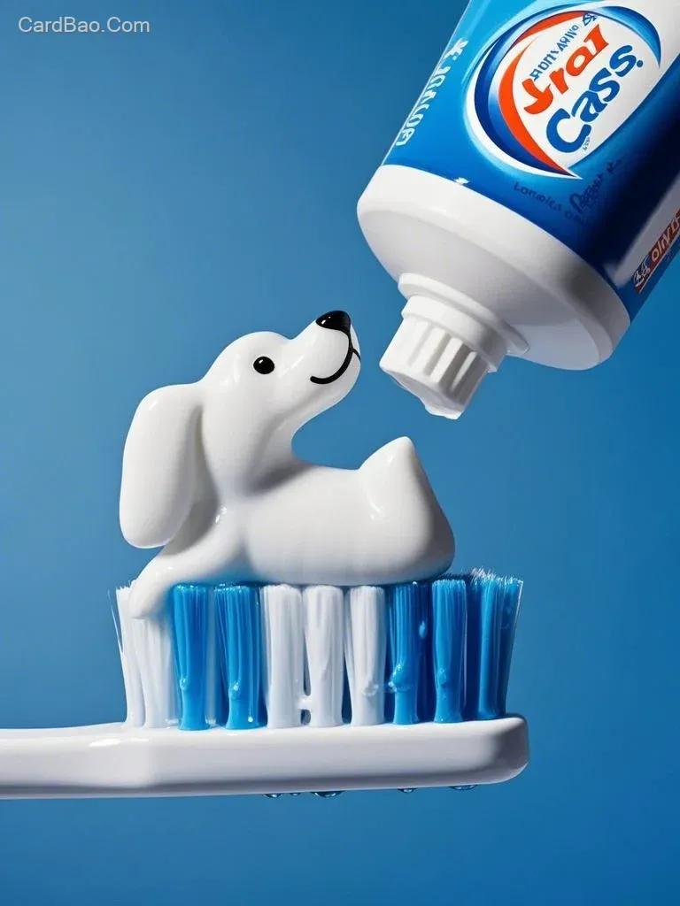 一只佳洁士牙膏挤出白色小狗状牙膏在牙刷头上