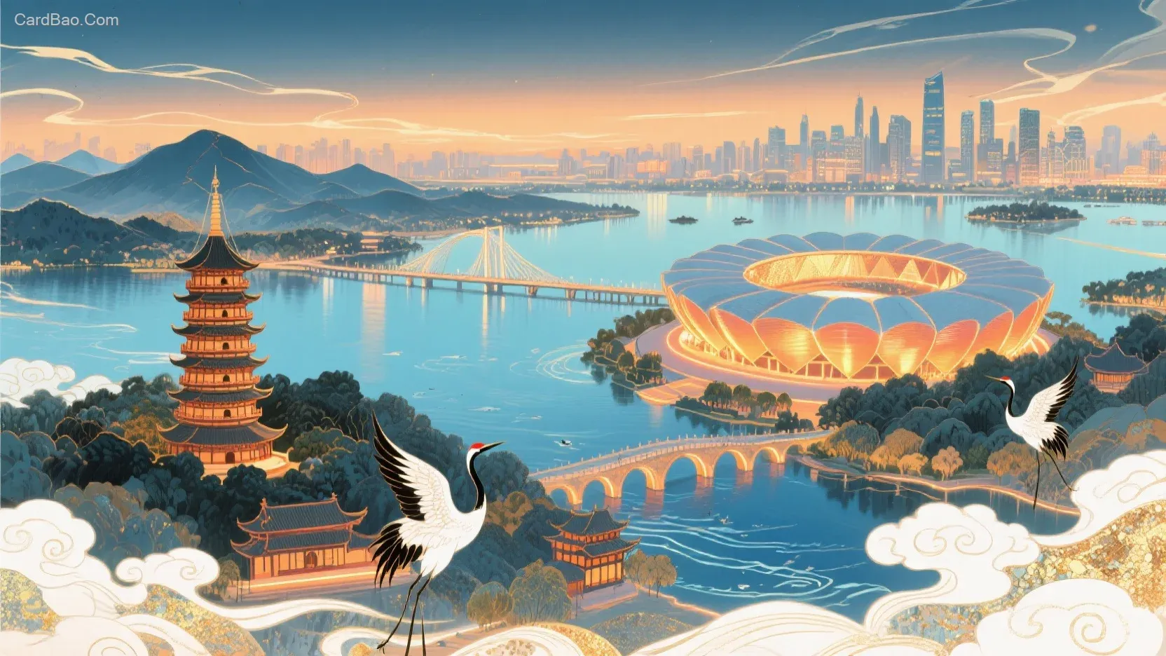 一个有山有水的杭州城市手绘图,插画,层次分明,景色尽在眼底,壮阔雄伟,令人震撼,西湖、雷峰塔、灵隐寺、京杭大运河、钱塘江大桥、杭州国际奥体中心、城隍阁,岩彩板绘,概念光影,流动丝绸,透光,手绘质感,仙鹤,中式意境,水墨晕染,海水纹,祥云纹,蓝、桔、橙、金、白色交织在一起,荧光渐变,发光的线条,梦幻,几何构图,电影灯光,16k高质量作品,艺术,Alberto Seveso, James R. Eads,Octane渲染。