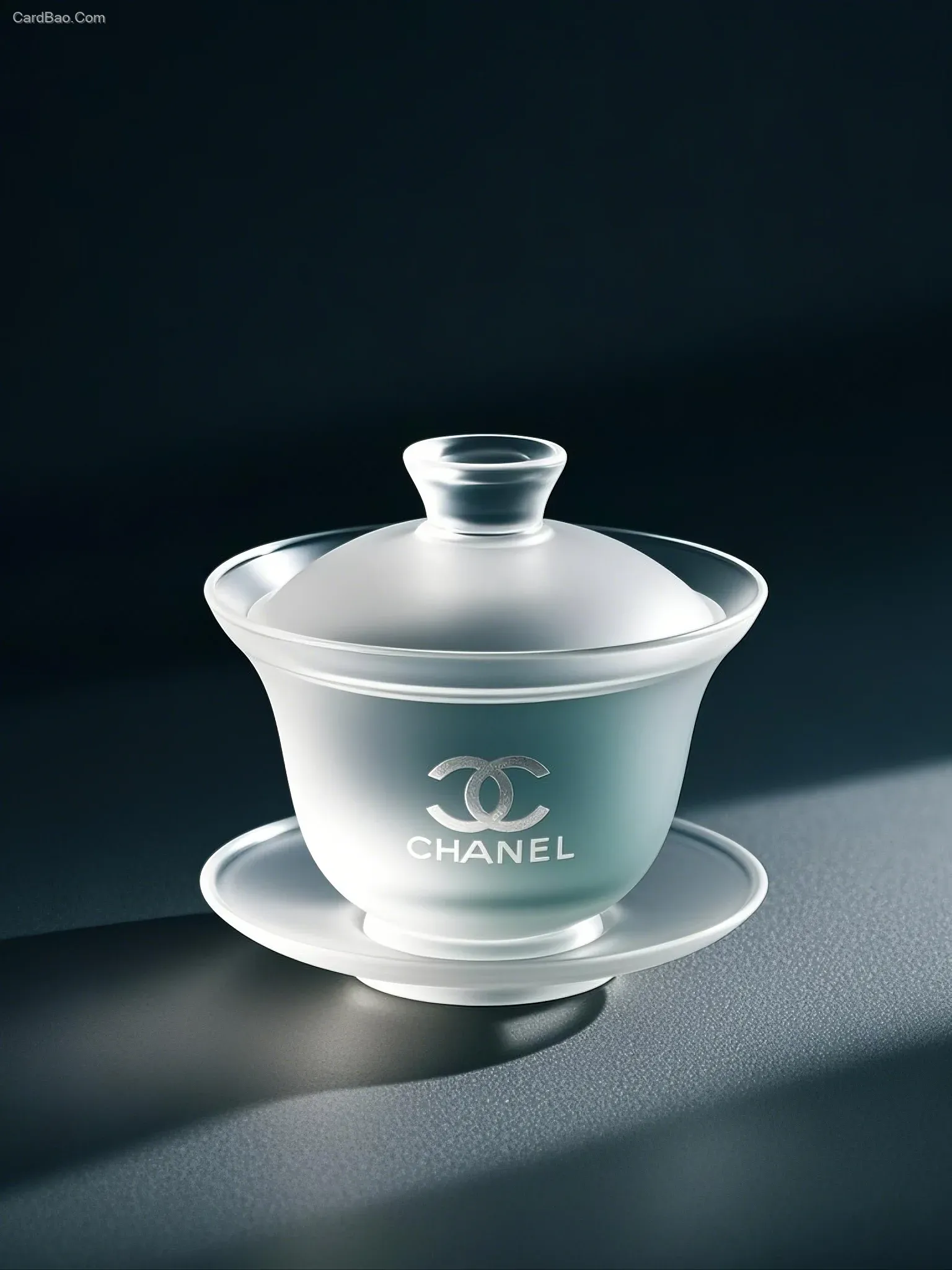 A gaiwan tea cup made of frosted transparent glass, with the Chanel brand logo as the underprint, in a gradient of Morandi color palette, against a clean, dark - colored pure background. Shot from the front, horizontally. Luxury - item shooting, commercial shooting, product design, indoor shooting, with movie - level lighting, in a clean environment. It is a high - end art piece for collection, related to art, and the product details are clearly visible.