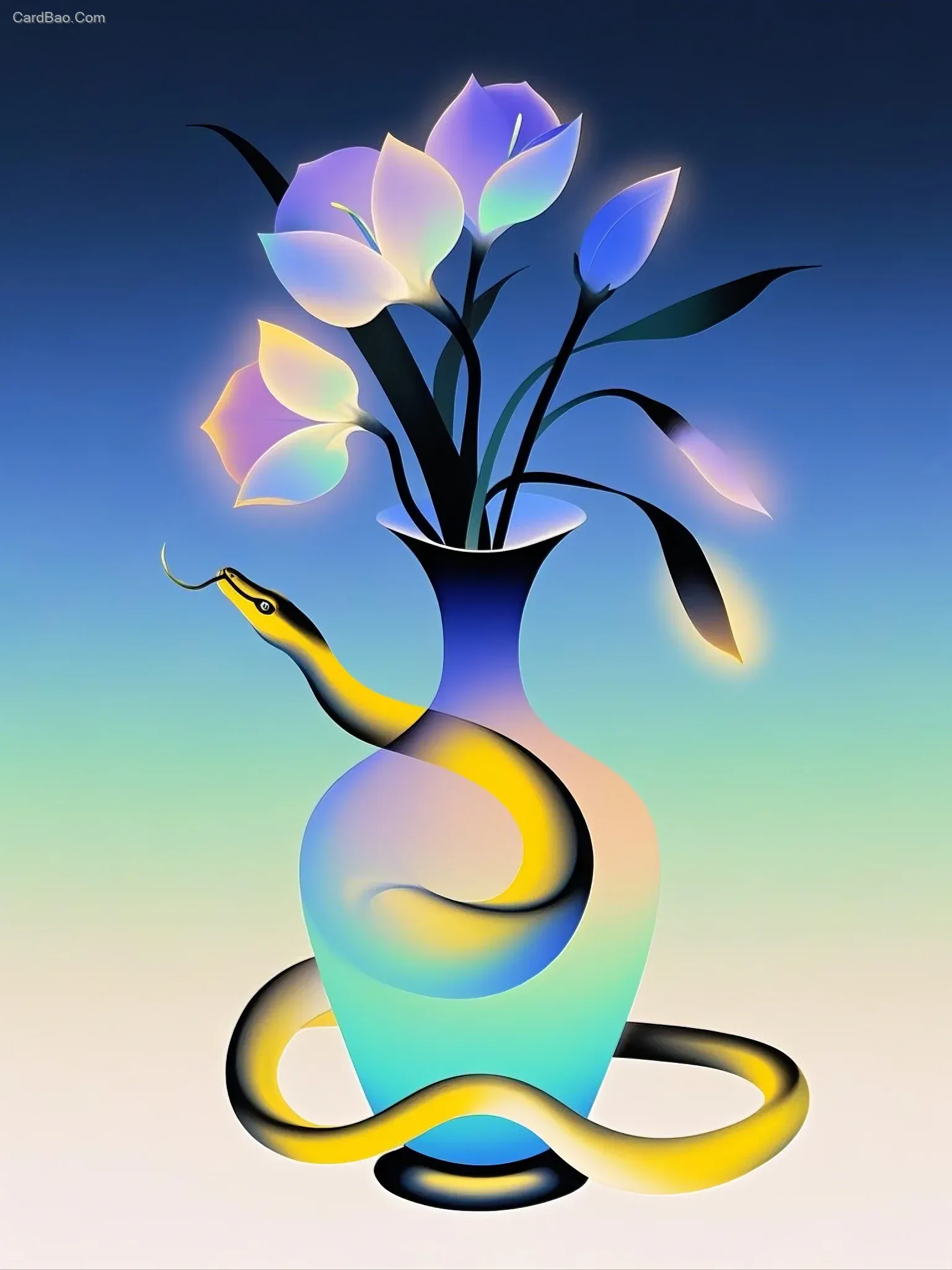 Minimalist aesthetics, minimalist style, with strong colors and a sense of high - class. Chinese - style aesthetics. A stunning flat illustration. Cold - toned, presenting an extremely elegant vase, with a long and slender yellow snake coiling around the vase, and the snake's head is at the same height as the mouth of the vase. There are several flowers in the slender vase, minimalist, and the gradient vase glows. Laid out with light and elegant gradient colors, it smudges out a dream - like fairy - land atmosphere, set off by a minimalist and clean blue - gradient background. It combines beautiful Chinese - style aesthetics and flat - abstract avant - garde art. It is like James Turrell's light - and - shadow illusions, yet without losing the delicate brushstrokes and charm of traditional Chinese meticulous paintings. The art of flower arrangement is endowed with divinity. An abstract expressionist approach is used to outline a dream - like picture. Every line and every touch of color is exquisitely detailed, and the overall picture quality reaches 4K ultra - high - definition, dreamy and full of artistic tension.