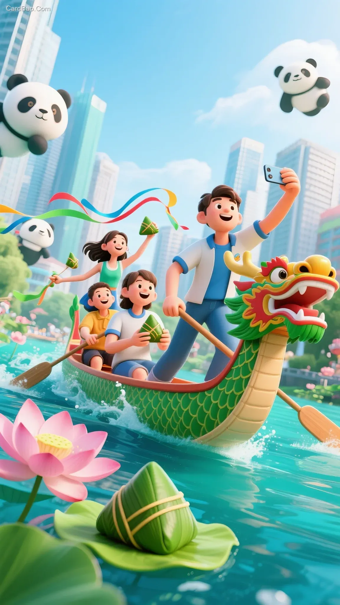A 45 - degree upward - shooting angle, high - saturation colors, 3D cartoon style. In the foreground is a group portrait of young people rowing dragon boats: college students taking selfies while holding zongzi (rice dumplings), girls waving colored ribbons, and boys rowing dragon boats vigorously forward. Their movements are exaggerated and vivid. The urban background presents the scene of pandas in Chengdu. High - definition without blurring, and the macro lens highlights the details of blooming lotus flowers and green zongzi. The overall main tone is blue - green.