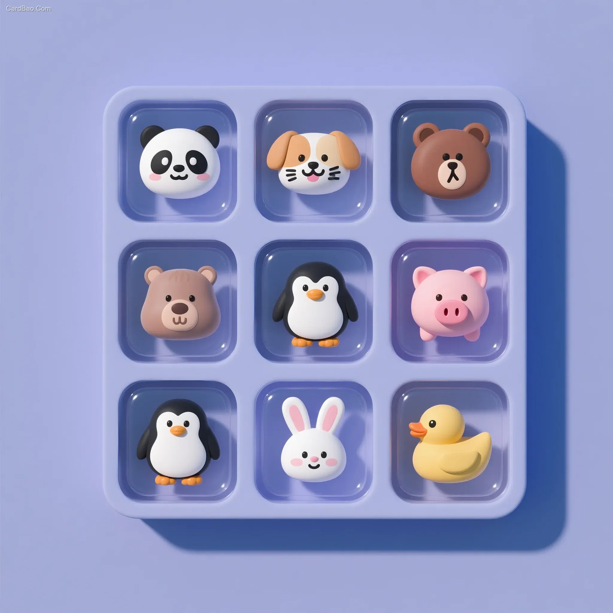 The picture shows a blister pack with a total of 9 compartments in 3 columns and 3 rows. Instead of pills, different icons are placed in each compartment, namely panda head, cat head, dog head, bear cub head, capybara head, piglet head, penguin head, rabbit head, and duckling head. It is in a cute three - dimensional style, and the picture has the texture of movies and advertisements.