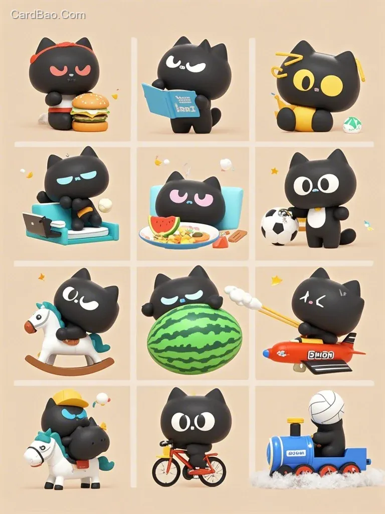 3x3 grid graph, 3D rendering, blind - box style, PVC translucent, cute cartoon, a cute black cat, emojis, various expressions, angry, happy, depressed, worried, different emotions, different postures, at work, having a meal, in class, going to work, sleeping, studying, small life scenes, minimalism, hand - drawn illustration style, light main color.