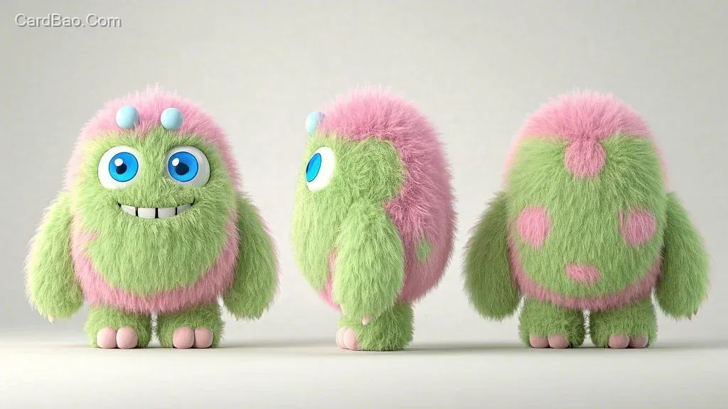 3D卡通角色设计,毛茸茸的可爱小怪物,微笑,三视图,正视图,侧视图,后视图,毛绒材质,干净背景,多巴胺配色,高级,充满创意,极简,