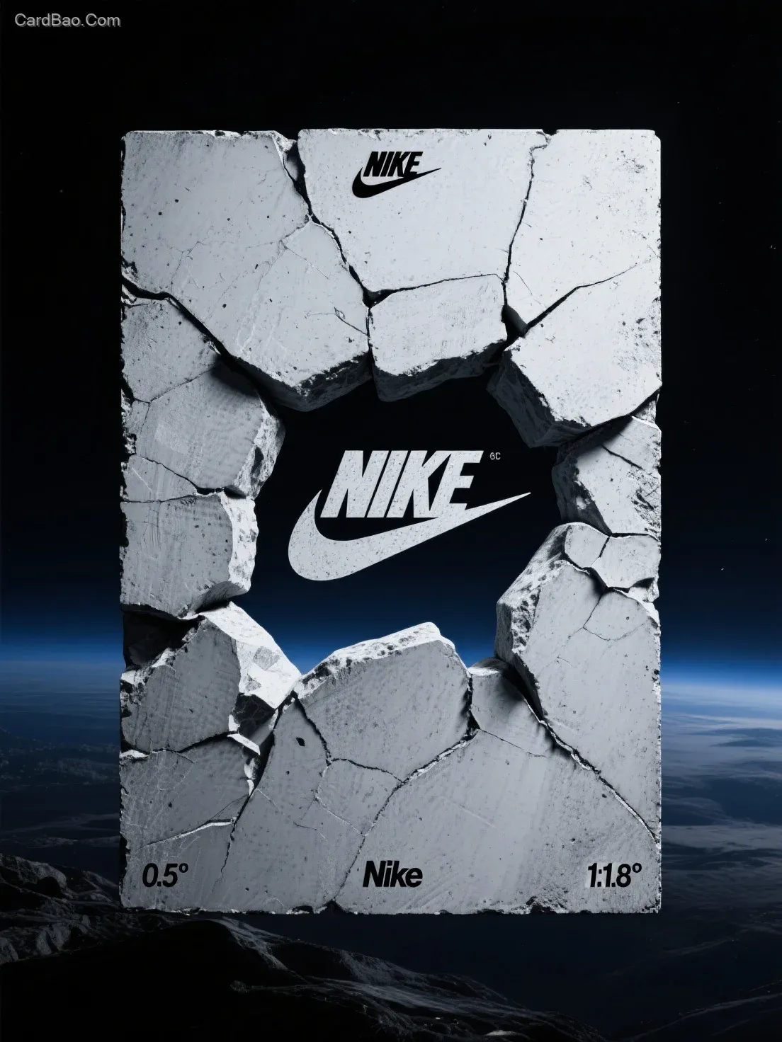 玄武岩雕刻的NIKE标志以错落阵列刺破深空背景,0.5cm级裂纹在硬光下形成工业级阴影。混凝土材质0.7粗糙度表面与潘通Black 6C基底构成1:1.8光比碰撞,粗粝美学与精密排版共筑字体海报的力量图腾