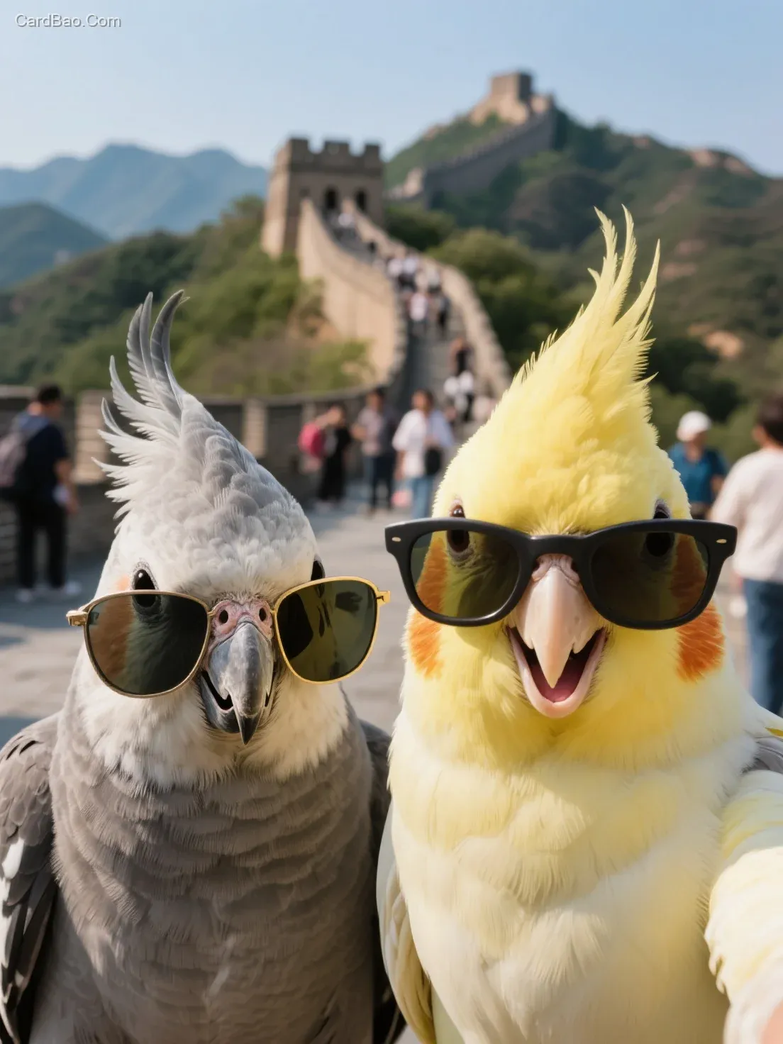 Realistic, lifelike, selfie, close - up of a face, a half - length photo of two cockatiels as if they were tourists. One is a normal grey cockatiel wearing sunglasses, and the other is a lutino cockatiel also wearing sunglasses. Front - facing, close - up, with their beaks slightly open as if smiling. It is a selfie, and the background is the Badaling Great Wall and a small number of tourists, with a little motion blur.