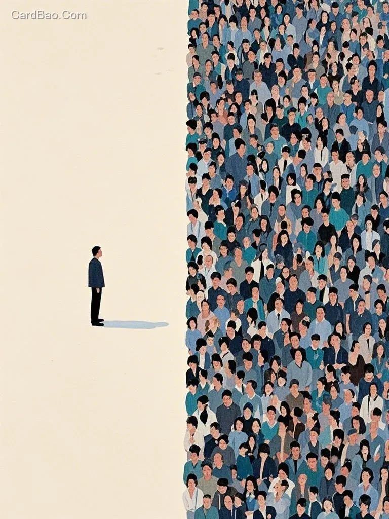 画面左边只有孤零零的一个人,右边有密密麻麻一大群人,左右两边的人面向对方,左右两边的人画风一致,简约画风,大片留白