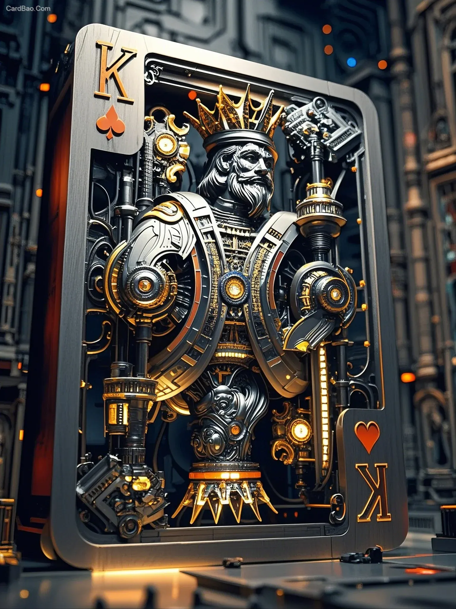 这幅机械化扑克牌艺术品的构思无疑是极具创意和视觉冲击力的。想象一下,背景模糊的巨大“K”牌如同一座宏伟的雕塑,采用复杂的机械构造和镂空雕刻,国王正从中挣脱而出,身体出来一半,展现出一种强烈的动态感。每一个细节都经过精心设计,剪纸艺术的元素让整个作品显得更加生动。