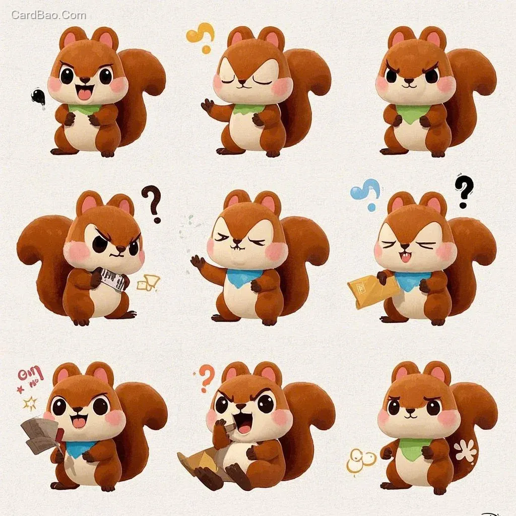 Emoji pack, chibi style, kawaii, minimalist style, a squirrel, cute art style, animated character design, Disney character style, featuring expressions like happy, angry, sad, surprised, confused, and others (9 expressions in total), various poses and expressions, different emotions, arranged in a 3x3 grid, white background, neatly arranged, 8K resolution, cute style.