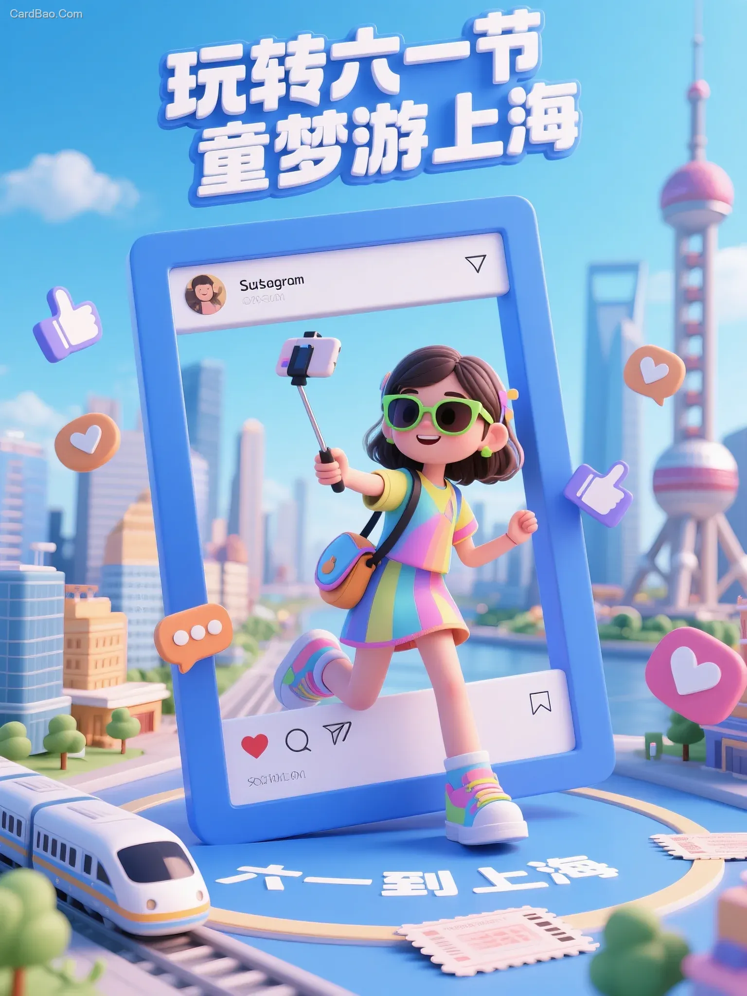 创意构图,高饱和度,3D风格,造型可爱,上方立体字“玩转六一节,童梦游上海”女孩儿童,戴时尚设计感太阳镜,多巴胺衣着,斜挎包,欢乐,一只手拿着自拍杆自拍。迈步走进一个巨大的社交媒体相框( instagram),一只脚已踏入相框,另一只脚仍留在现实地面。社交相框界面细节清晰可见,含用户名、点赞数、评论图标等UI元素。相框周围漂浮着立体的点赞图标、评论图标与对话图标,地面环绕的火车票写着“六一到上海”,背景为上海城市微缩景观模型(上海),高饱和度蓝色天空 ,写实