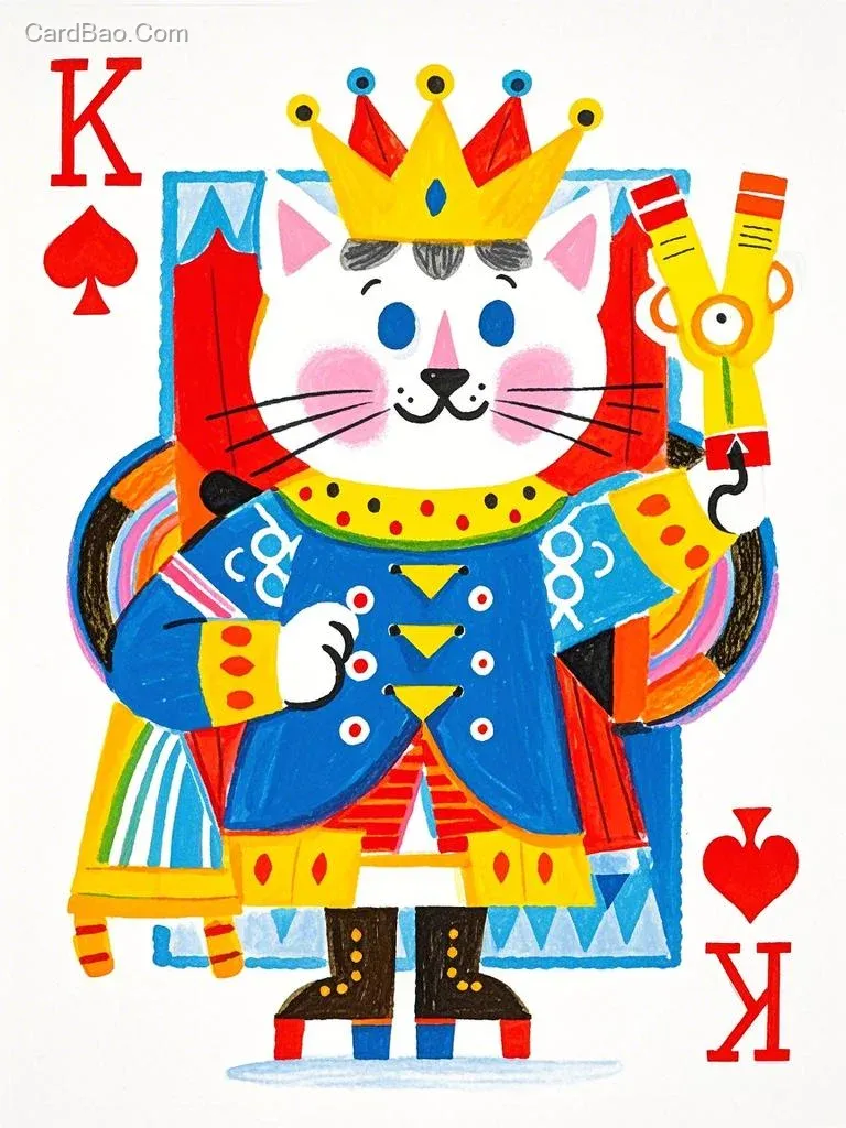 Picture book illustration, hand-drawn illustration, cute and healing, children's picture book art style, crayon drawing style, a King K poker card with the king figure being a cat king, white background