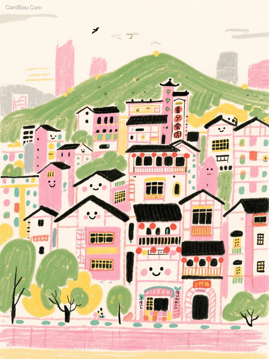 吴冠中和Yeoniu Choi结合的风格的横截面水平视角的可爱涂鸦,手绘插画,治愈系画风格,重庆森林,山城建筑,洪崖洞,